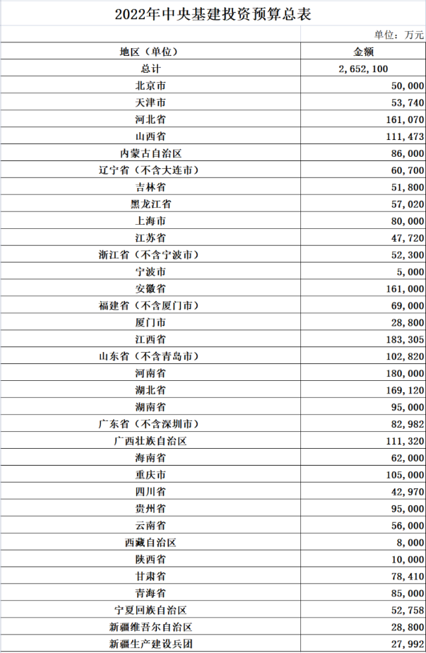 各省中央基建投資預算如下(各省詳細項目見后文):
